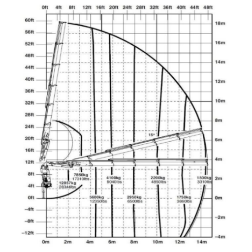 • Grúa Capacidad Máxima trece mil (13.000) Kg @1.9M, 1.500 Kg @14 M.